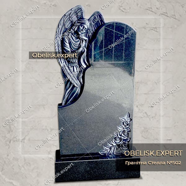 Гранітна габрова монолітна стелла з ангелом та трояндами.