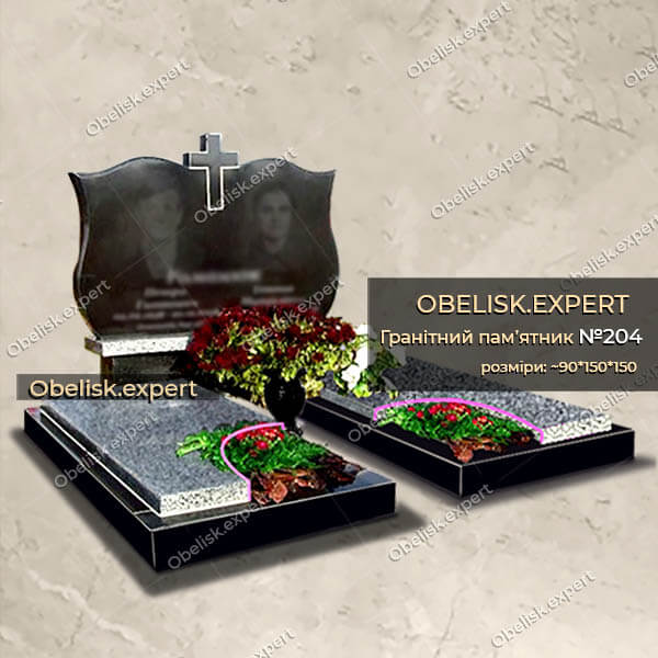 Комбінованний подвійний пам’ятник із сірого та чорного гранітів. На даній конкретній моделі квітничок практично повністю закритий, однак його за бажанням можна і більше відкрити.